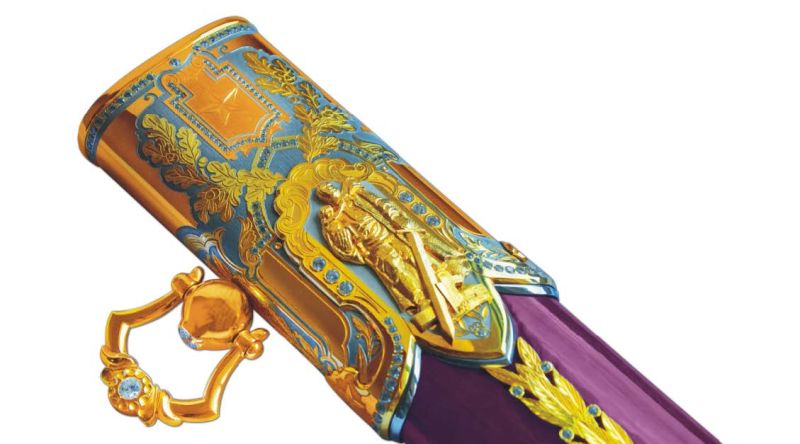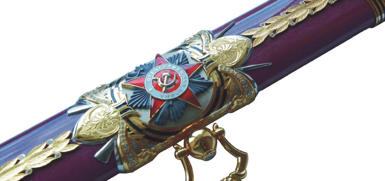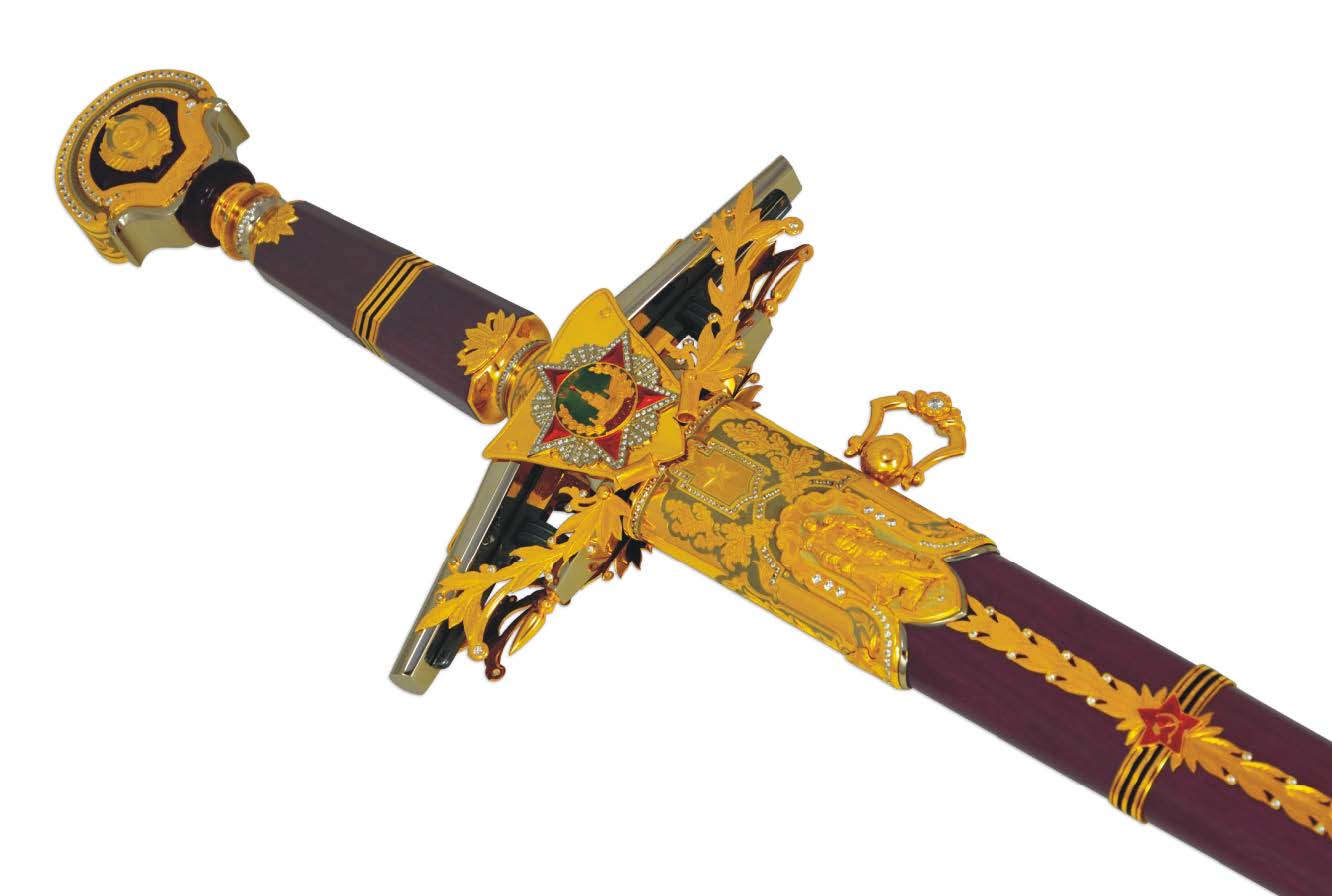 Между собой фурнитуру ножен соединяет гирлянда из ветвей лавра с инкрустированными камнями белого цвета, которую пересекают эмалевые георгиевские пояски с центральным элементом в виде красной звезды с серпом и молотом в эмали.